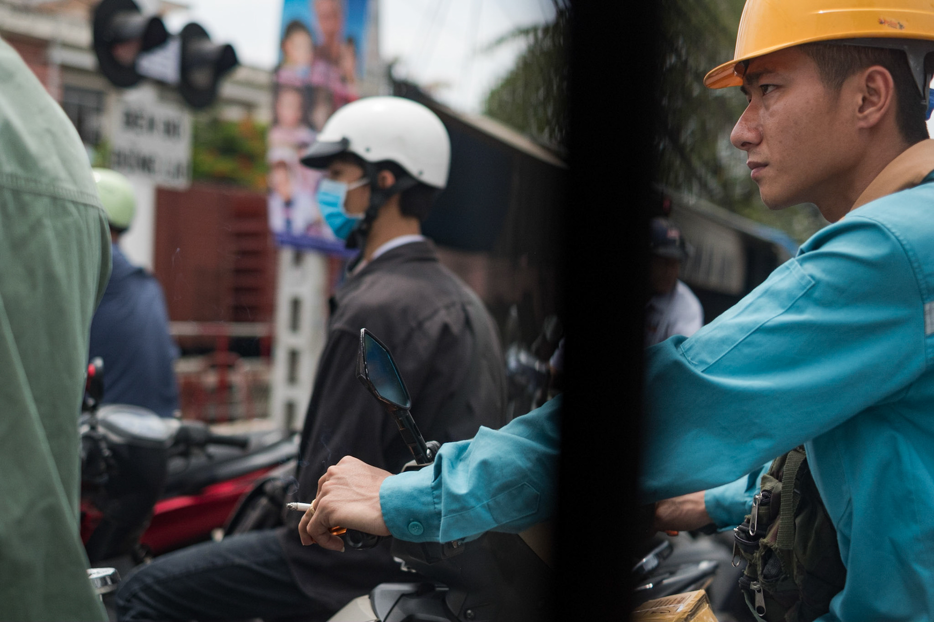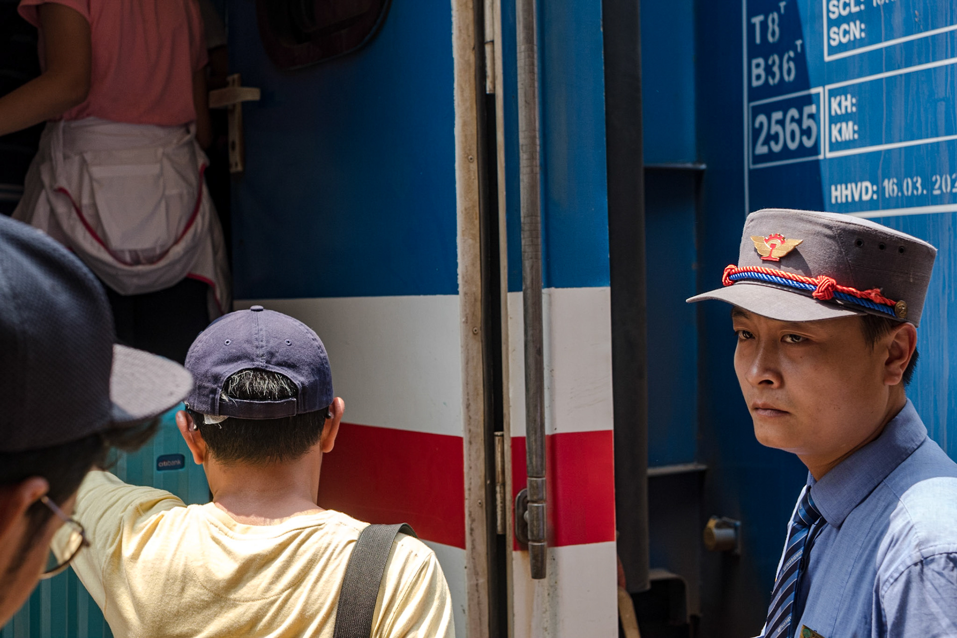 The Rapture of Train Travel II. A man smokes a cigarette while leaning through a window of a train before departure at Bangkok train station.