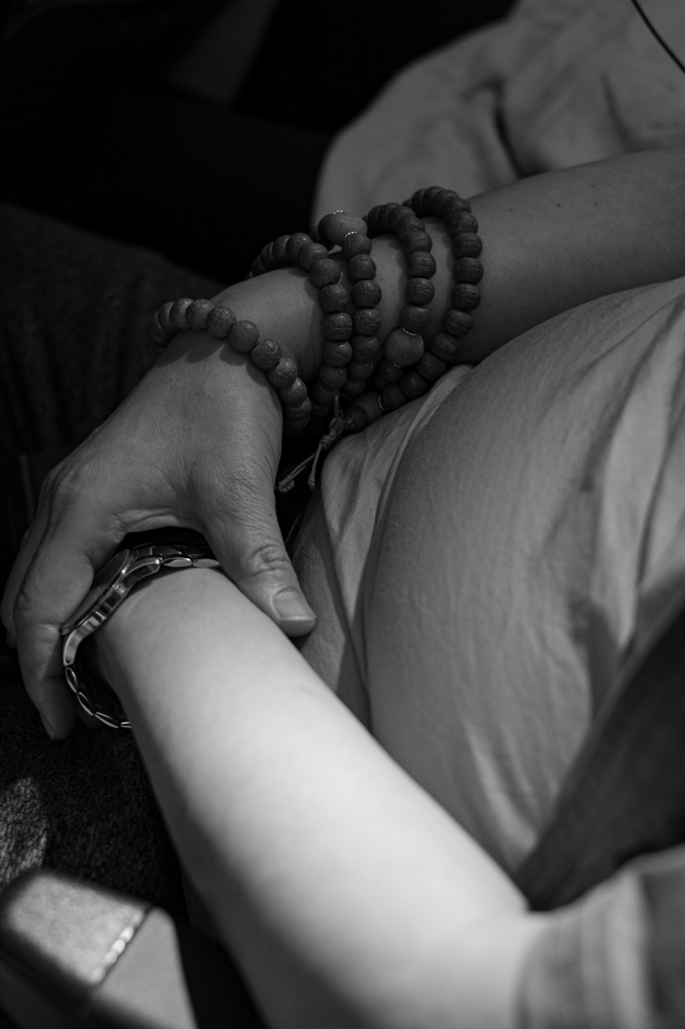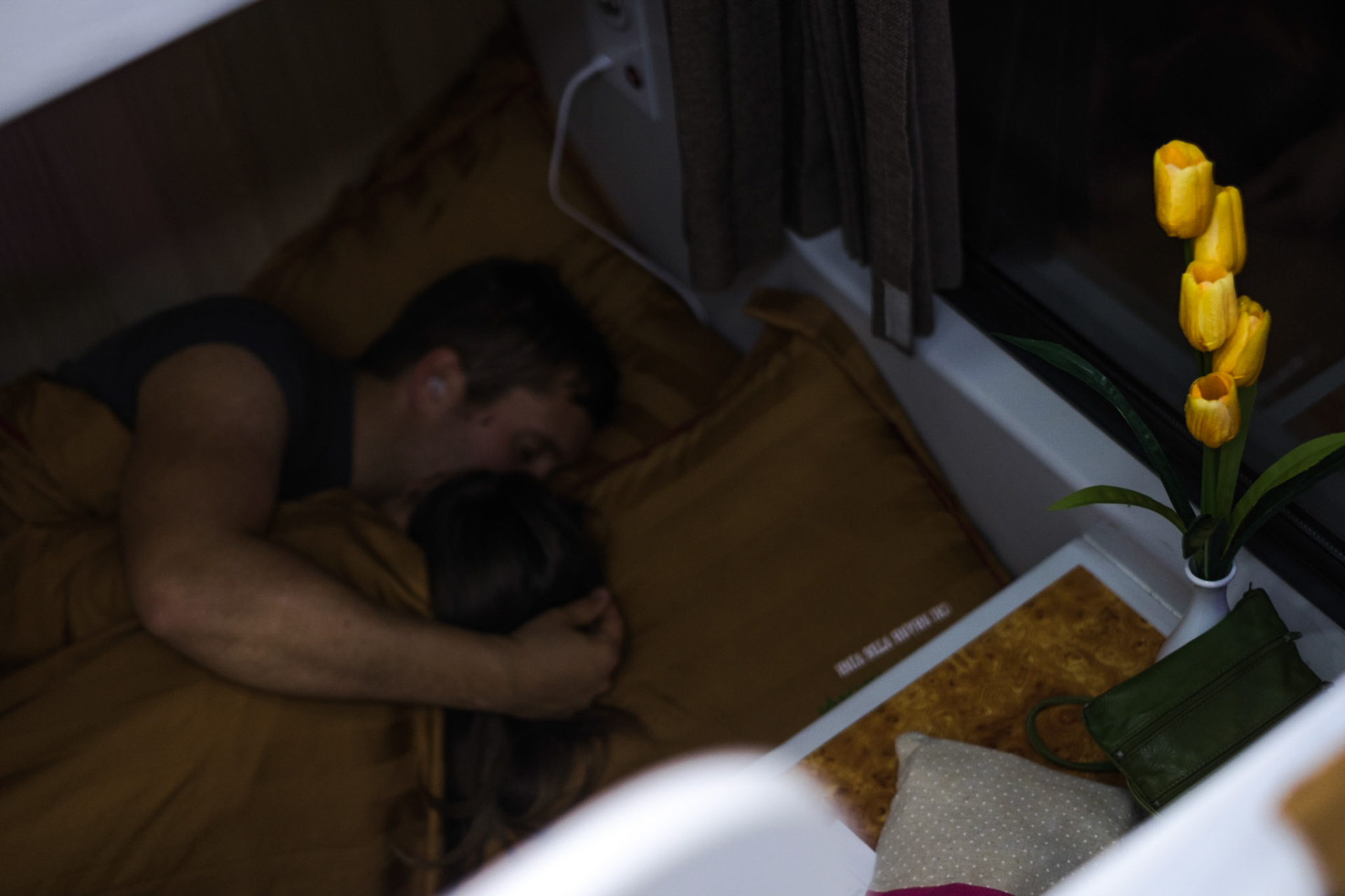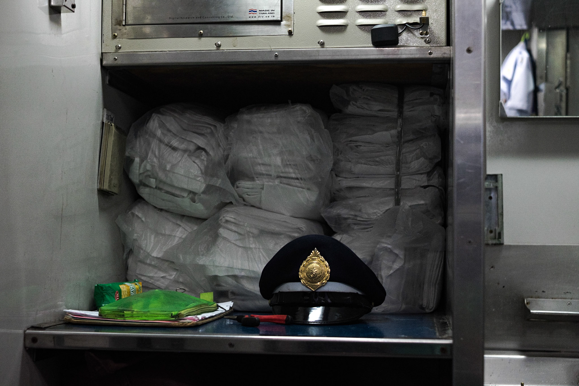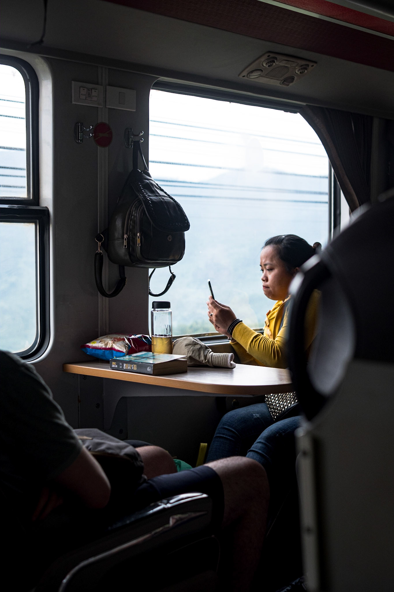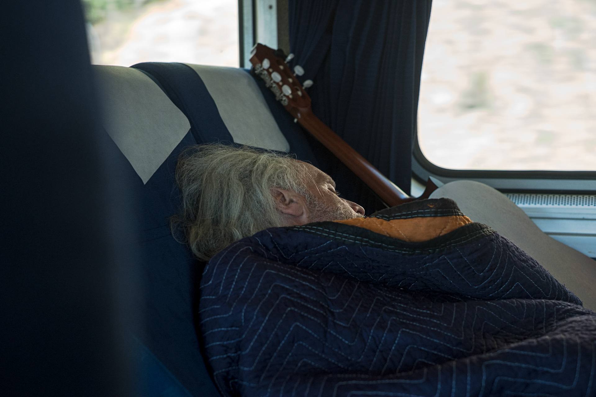 An old man sits opposite his son (who is below me) on the lower bunk of a train departing from the station in Bangkok. He reminded me of an aged, beloved pet—a dog or cat—that because it is so weak, frail, and thin needs care and guidance for nearly everywhere it goes.